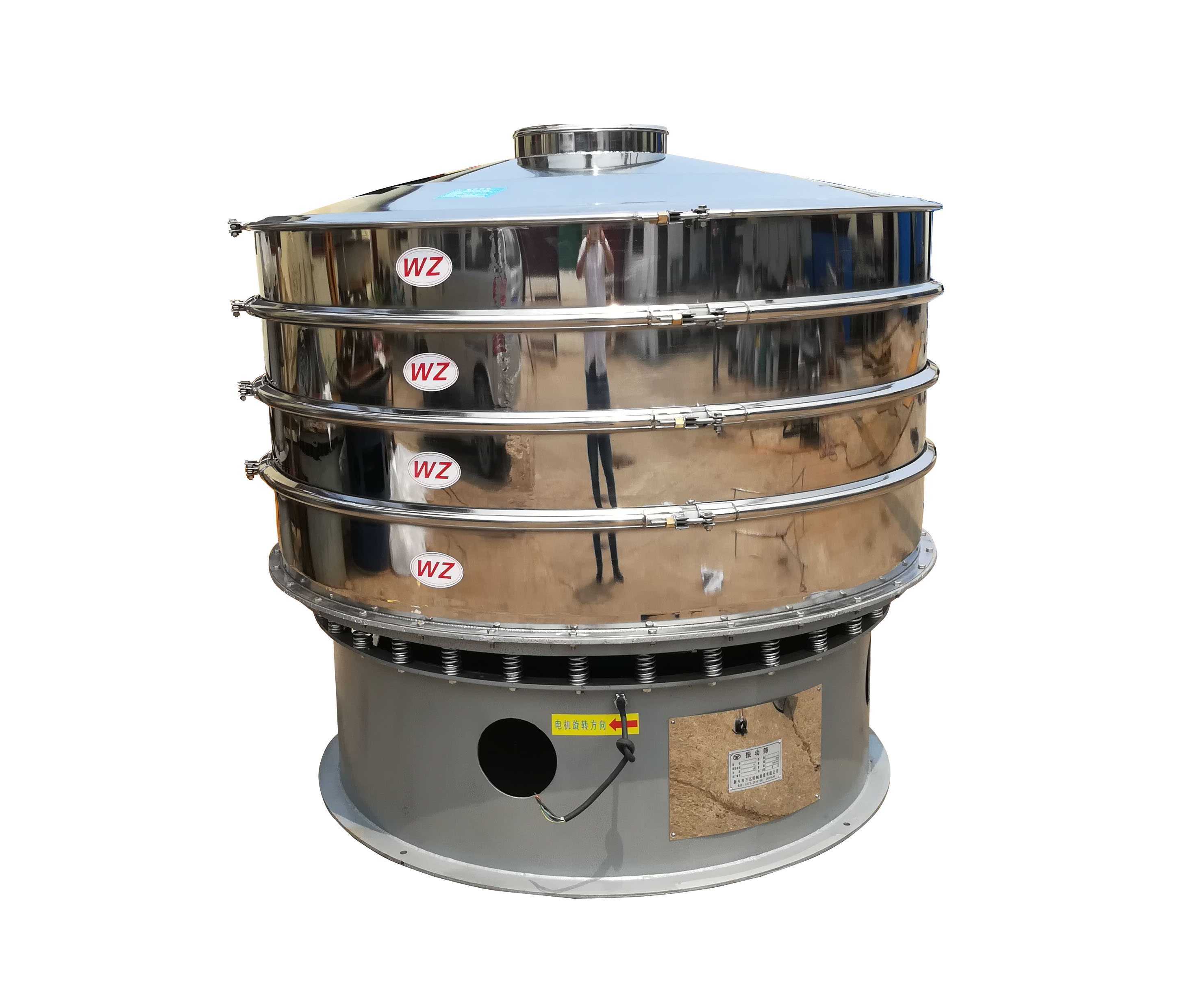 2.旋振篩的篩面是圓形篩網,物料入口位于圓形篩網的中心位置,物料從篩面中心加入,由于篩面的旋擺振動,使得物料呈螺旋線方向圓周運動,出料口可以沿著圓周方向任意布置,這使得旋振篩制造簡單方便。